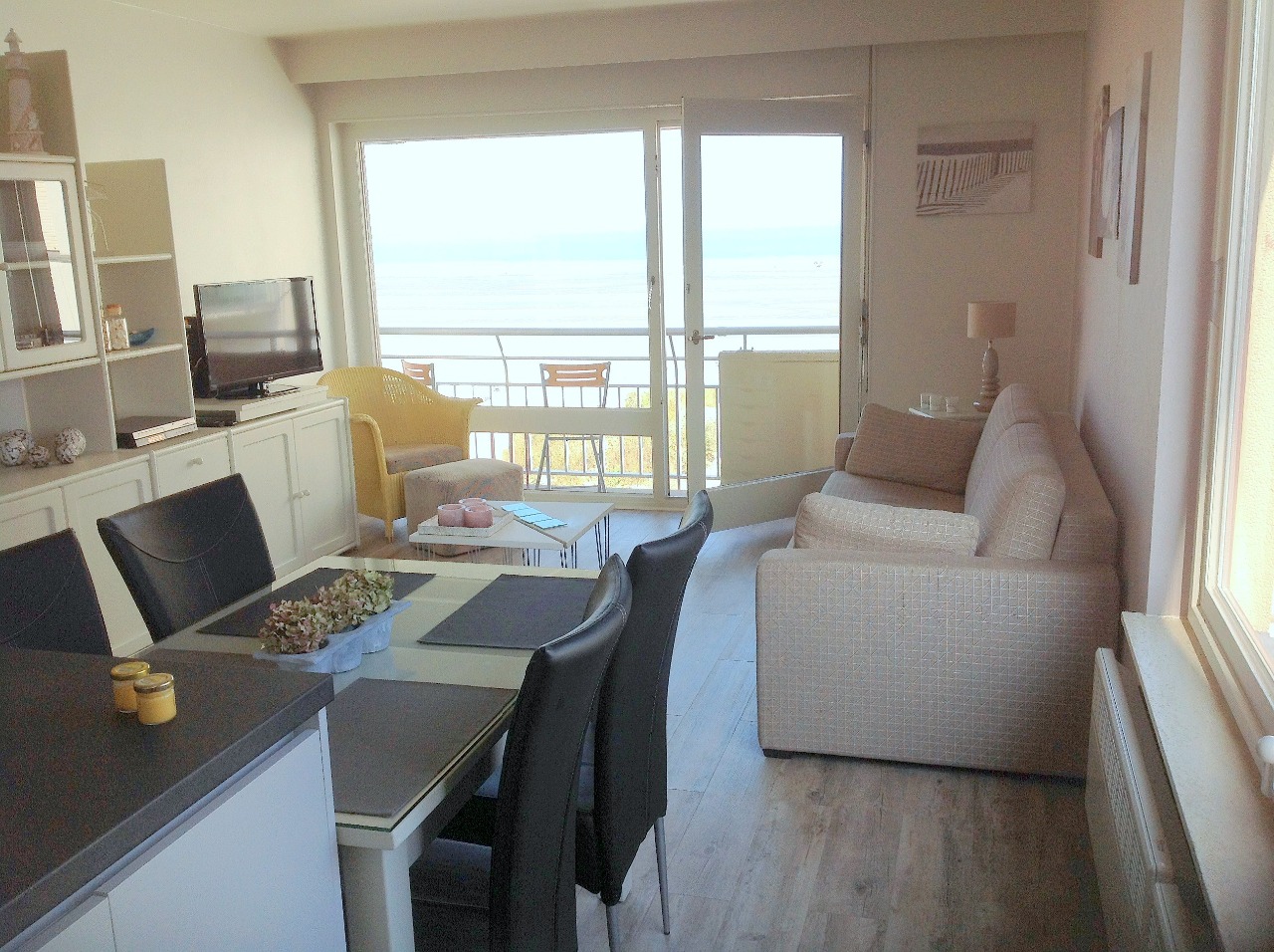 La terrasse frontale mer sur toute la largeur du séjour permet de place une petite table et deux chaises.